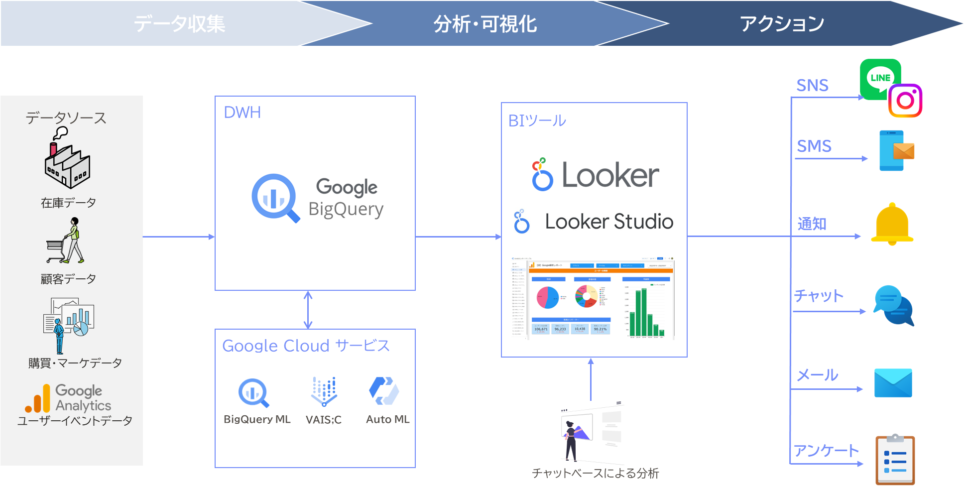 会社名 * お名前 * email * 電話番号 本文 個人情報保護方針 個人情報の取り扱いについて 上記「個人情報保護方針」及び「個人情報の取り扱いについて」について、同意した上で、問い合わせます。 送信 小売り向けソリューション on Google Cloud 検索・レコメンド・データ分析を一気通貫で提供するAI統合パッケージ 小売り向けソリューション on Google Cloud ECのCV改善、広告効果測定、需要予測…。 売上向上のために取り組むべき分析・改善業務は多岐にわたり、対応は日々複雑化している 需要予測 を活用した 適正な在庫管理 ECのCVR を 向上させる施策の検討 SNS広告 の効果を 最適化 顧客の声を活かした 効率的な 売場・商品改善 豊富なAI/データ分析サービスをもつGoogle Cloudで運用負荷を下げて効率的に運用しませんか <サービス例> 需要予測 ・Google Cloud が誇るデータ分析サービスであるBigQuery や AutoML を活用して、商品/SKU別に需要予測を実施 ・大規模データを高速処理できる基盤と、Googleが提供するレコメンドの品質を活かし、プログラムコードなしで運用に強い予測を実現 検索/レコメンド ・ Vertex AI Search for Commerceによるユーザーのサイト行動に基づいた高品質な検索とレコメンド機能の提供 ・Google Merchant Center や Google Analyticsからの自動連係でデータ更新や設定作業の手間を最小限に抑制 顧客体験統合 ・店舗やECで得られた自由記述のアンケートデータを、生成AIで自動要約・分類し、従来見落とされていたお客様の本音・不満・改善要望を構造化して可視化、プロダクトやUX改善に直結 ・Googleの生成AIであるGeminiにより、コストを抑えながら“使える定性データ”に変換 分析・ダッシュボード ・Looker と BigQuery を連携することで、事業部横ぐしで、ECや実店舗の売上・在庫・広告効果をリアルタイムに可視化 ・ノーコードでのドリルダウン分析や部署別ダッシュボード共有により、検索/レコメンド/広告効果などの分析が現場でもすぐに“使える”ようにデータ環境を整備 ※お客様の課題に合わせて必要なサービスを提供いたします。 こちらに記載されていないサービスもありますのでお問い合わせください 全体図 サービスの流れ よくあるご質問 Q 検索レコメンド機能だけを利用したいのですが、可能でしょうか (需要予測はすでに別のシステムで対応しています。) A はい、可能です。 お客様が必要な機能のみに絞ってカスタマイズできます。 Q 自社システムとの連携など、個別のカスタマイズにも対応できますか A はい、可能です。 お客様の要件に合わせて柔軟に対応いたします。 Q 分析にはどのようなツールを使用しますか A お客様がBIツールをお持ちでない場合は、LookerやLooker Studioの活用をご提案します。 もちろん、現在ご利用中のBIツールへの接続もサポートいたします。 Q 分析対象のデータは、どこに保存されていても利用できますか A はい、可能です。 基本的にはBigQueryにデータを格納して分析・可視化を行います。 お客様の環境からBigQueryへのデータ移行についてもサポートいたします。 ご意見・ご相談・料金のお見積もりなど、お気軽にお問い合わせください。 お問い合わせフォームはこちら 03-3342-8010 Google Cloud 担当まで 受付時間 : 10:00 ~ 17:00 月曜日〜金曜日(祝日、当社休業日を除く) ご意見・ご相談・料金のお見積もりなど、お気軽にお問い合わせください。 お問い合わせはこちら 当サイトではクッキー(Cookie)、Googleアナリティクスを利用します。 「同意する」をクリックいただくことで、サイト上での最高のエクスペリエンスをご提供いたします。 ※詳細は以下をご覧ください。 外部送信ポリシー プライバシーポリシー同意する同意しない