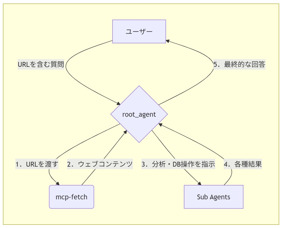 今回の改修では、このroot_agentが直接利用できる新しい武器として、MCPのfetchツールを追加します。これにより、root_agentはユーザーの質問にURLが含まれていることを検知すると、他のサブエージェントを呼び出す前に、まずMCPツールを使ってウェブページの内容を把握し、その情報を後続の分析タスクのインプットとして渡すことができるようになります。
