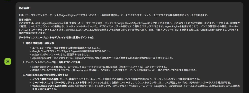 このプロンプトを受け取ったエージェントは、まずプロンプトの指示に従い、MCPのfetchツールを呼び出して指定されたURLのコンテンツを取得します。その後、取得したテキストデータを分析し、要約と重要ポイントの抽出を行います。