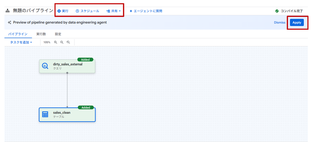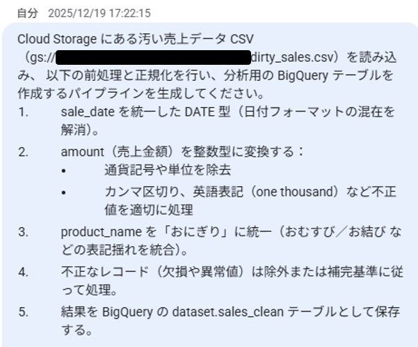 2025年12月24日 【Google Cloud】BigQuery Data Engineering Agent使ってみた!~AIで進化するデータパイプライン開発~ BigQuery Dataplex Google Cloud 生成AI(Generative AI) 検索する Popular tags 生成AI(Generative AI) Vertex AI Search Looker Studio BigQuery AlloyDB Google Workspace 事例紹介 Cloud SQL Category Google Cloud Author えいきち SHARE 目次 BigQuery Data Engineering Agent とは? BigQuery Data Engineering Agent の主な機能/特徴 使い方 実際に利用してみて 感想&まとめ Content 多くの企業が AI の業務活用に取り組み始めています。しかし、企業内で AI 活用を進めようとした際、最初につまずくポイントとしてよく挙げられるのが 「データが整理されていない」 という問題です。 実際の現場では、形式がばらばらなデータや欠損値を含むデータ、命名規則が統一されていないカラムなど、いわゆる「汚いデータ」がそのまま蓄積されているケースも少なくありません。このような状態のままでは、どれだけ高度な AI モデルを利用しても、期待した精度や効果を得ることは困難です。 AI の精度を高め、継続的に活用していくためには、その前提となる データ分析基盤やデータパイプラインの整備が不可欠 です。 一方で、データエンジニアリングの現場では、BigQuery 上でのデータ整形や前処理など、時間と労力を要する作業(ちょっと面倒くさいな、、と感じてしまう作業)が数多く発生します。 例えば、以下のようなケースが挙げられます。 - 日付フォーマットが YYYY/MM/DD と YYYY-MM-DD で混在している - 数値カラムに文字列や NULL が混ざっている - データソースごとにカラム名や意味が微妙に異なっている このような「汚いデータ」を整形・正規化する作業は、AI 活用以前に必ず発生する重要な工程です。 こうした課題に対し、生成 AI の進化によって、「コードを書く」だけでなく、「データパイプラインの設計・改善・調査までを支援する」AI エージェントが登場し始めています。その一つが、BigQuery に統合された BigQuery Data Engineering Agent です。 本記事では、BigQuery Data Engineering Agent の概要を整理したうえで、利用方法と使ってみた感想を紹介いたします。 ※本記事は2025年12月22日時点の情報をもとに執筆しています。現在の時点では、BigQuery Data Engineering Agentはプレビュー機能として提供されています。 BigQuery Data Engineering Agent とは? BigQuery Data Engineering Agent は、BigQuery 上でのデータパイプライン開発を支援する AI エージェント機能です。自然言語で要件を入力することで、パイプラインの構成や SQL、処理フローの案を生成・提案してくれます。 従来のように、要件定義から SQL を一つひとつ手で書くのではなく、「どのようなデータを、どのように加工したいか」を文章で伝えるだけで、実装のたたき台を作れる点が大きな特徴です。 なお、このエージェントは パイプラインを自動実行するものではなく、あくまで生成・提案を行う支援ツール である点は重要なポイントです。 最終的な実行やスケジューリング、レビューは人が行います。 【公式ドキュメントより引用】 The Data Engineering Agent cannot execute pipelines.Users need to review and run or schedule pipelines. ※Data Engineering Agent はパイプラインを実行できません。ユーザーがレビューしてパイプラインを実行・スケジュールする必要があります。 BigQuery Data Engineering Agent の主な機能/特徴 BigQuery Data Engineering Agentの主な機能として下記の2つがあげられます。 ①自然言語によるパイプライン生成: 最も基本的な機能が、自然言語によるパイプライン生成です。 例えば、「○○ バケットからデータを読み込み、日付形式を標準化し、 ○○ という名前の BigQuery テーブルにロードするパイプラインを作成して」というような形でパイプラインの要件を指示すると、処理フローや SQL を含むパイプライン案が自動的に生成されます。 ②既存パイプラインの修正・改善支援: 新規作成だけでなく、既存パイプラインの修正にも活用できます。 例えば、以下のようなケースです。 カラム追加や型変更への対応 データ品質チェックの追加 処理ロジックの改善提案 既存のパイプラインを前提に、変更点や改善ポイントを踏まえた提案を行ってくれる点が特徴です。 BigQuery Data Engineering Agent は、単なる SQL 自動生成ツールとは異なる特徴として下記があげられます。 パイプライン全体の構成を理解したうえで提案する 既存のパイプラインを前提に、修正・改善案を出せる このように、パイプライン設計や改善を効率化する支援機能を提供する点が、BigQuery Data Engineering Agent の大きな強みだと思います。 使い方 BigQuery Data Engineering Agentは、BigQuery pipelines インターフェースあるいはDataformから利用できます。 利用にあたっては、事前にGemini Data Analytics API を有効化し、実行するユーザーあるいはサービスアカウントに対して『roles/dataform.codeEditor』と『roles/bigquery.jobuser』の権限を付与する必要があります。 本記事では、BigQuery pipelines インターフェースから利用する方法を紹介します。 ①まず