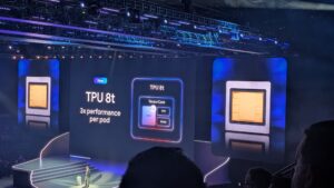 AIチップ 第8世代TPU(TPU 8t / TPU 8i) が発表され、実物がステージ上に登場するという演出がありました。