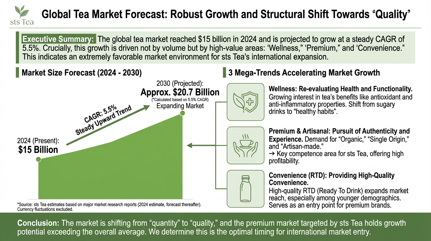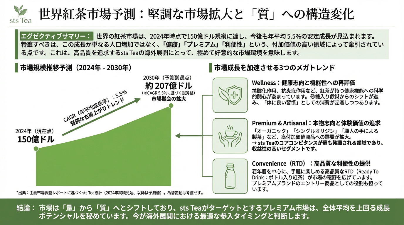 検索結果に基づく主な成長要因を図解して:「健康志向(抗炎症作用)」「プレミアム&オーガニック(職人の手によるお茶)」「RTDの利便性(ボトル入り茶)」。