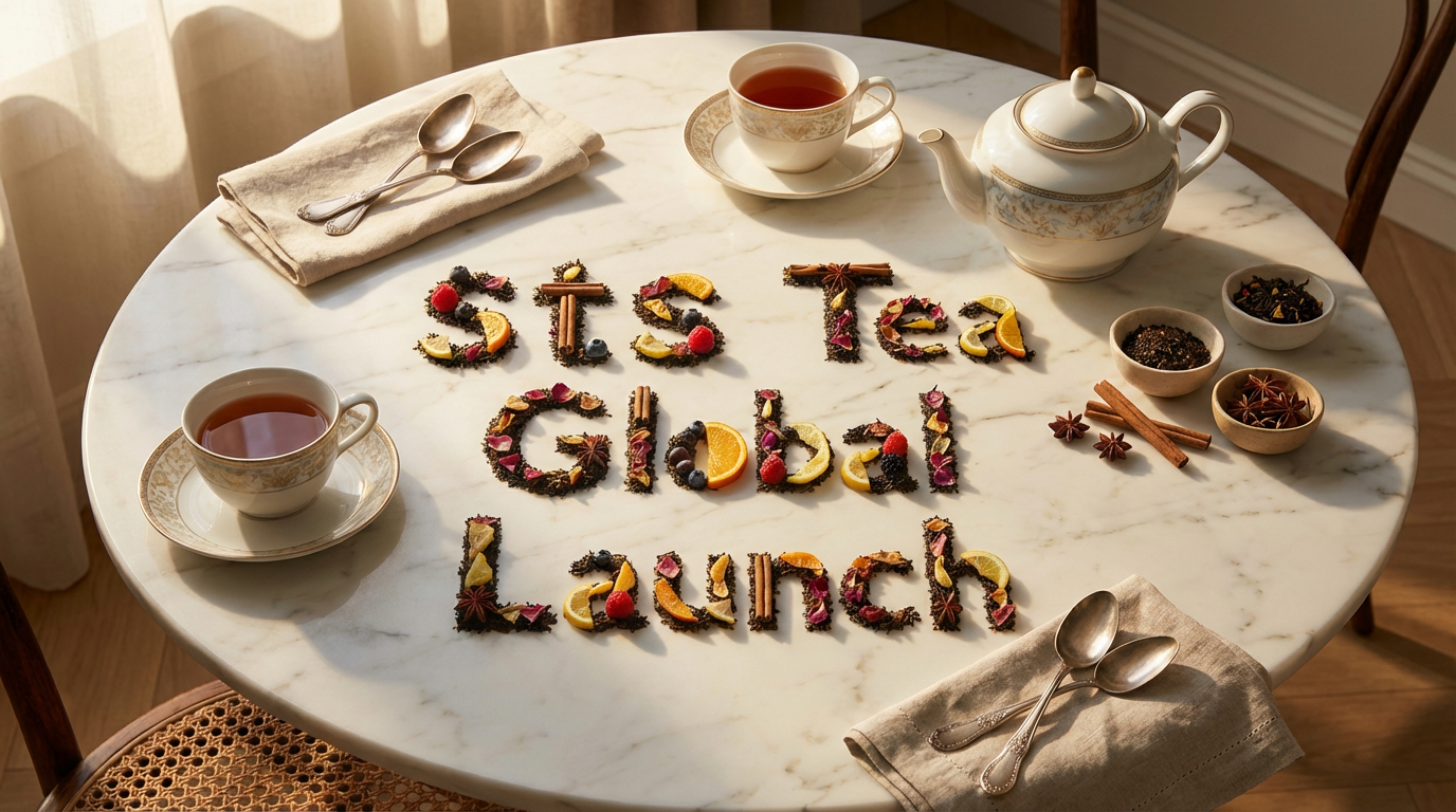 紅茶の茶葉と新鮮なフルーツで構成された文字で “sts Tea Global Launch” と書かれた、高品質な広告用画像を作成して。背景は高級感のある大理石のテーブルで、朝の光が差し込んでいる。