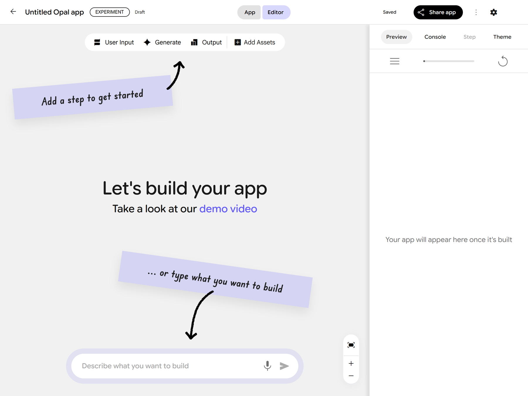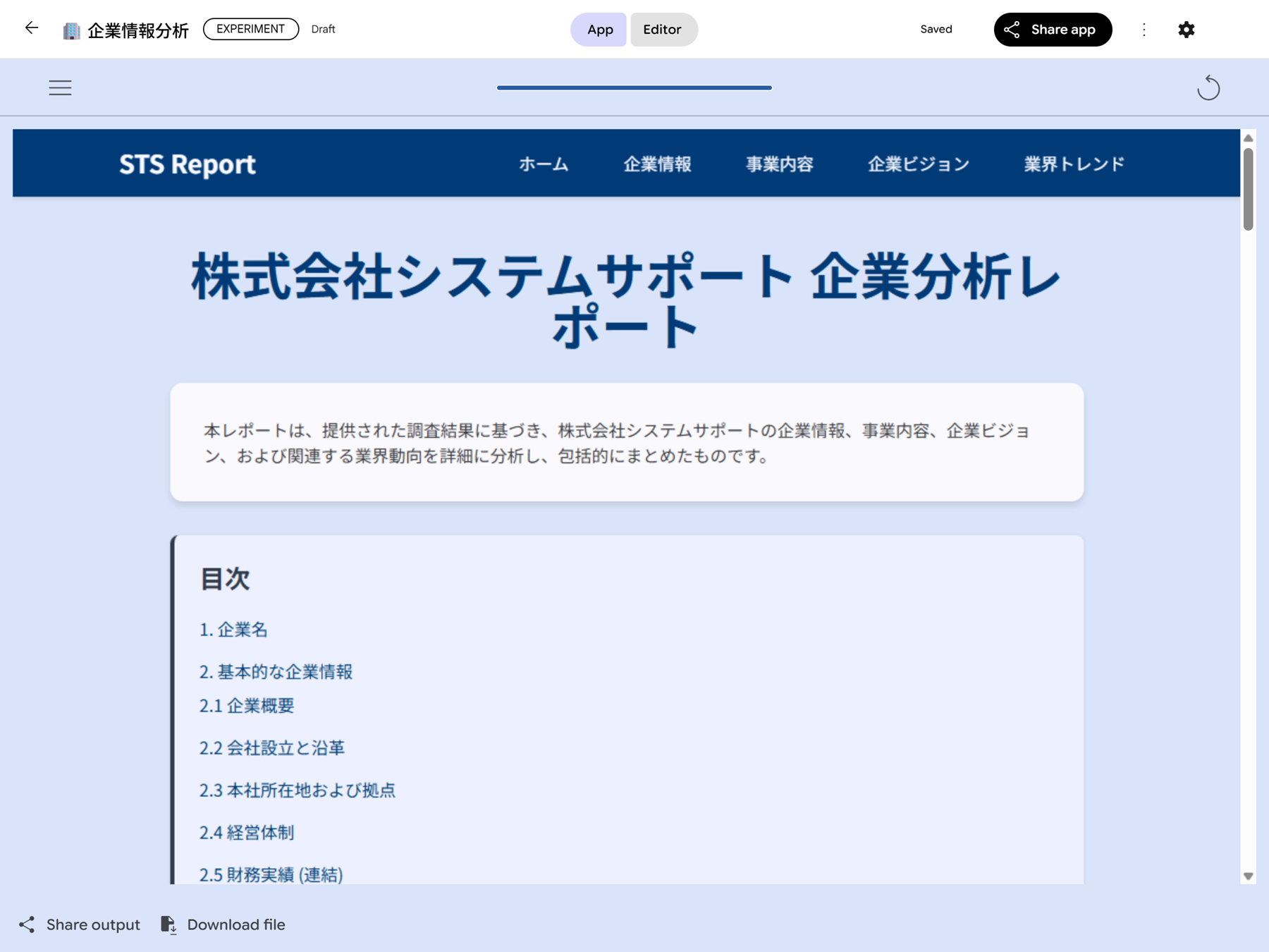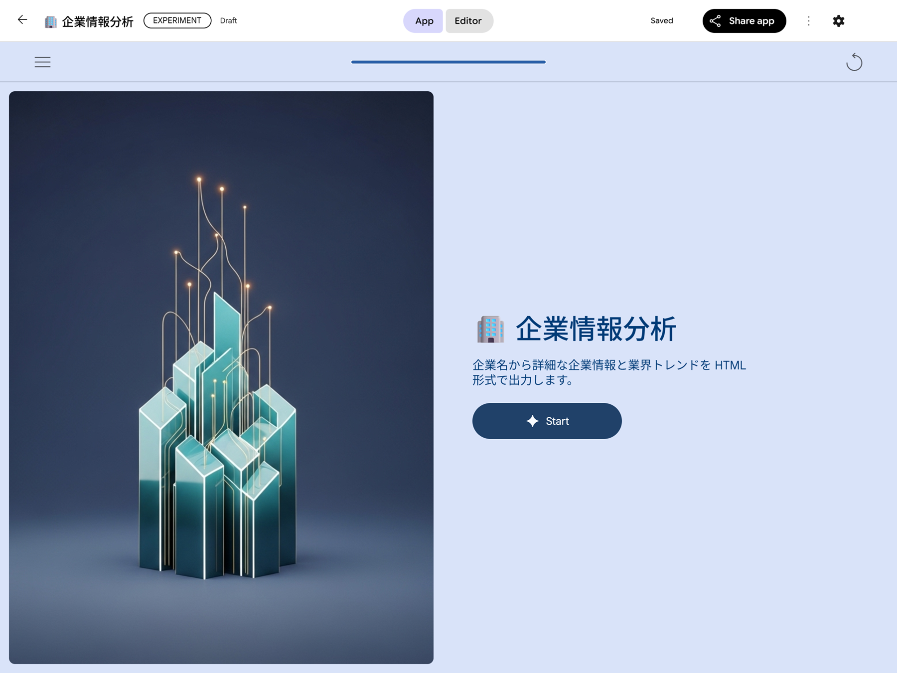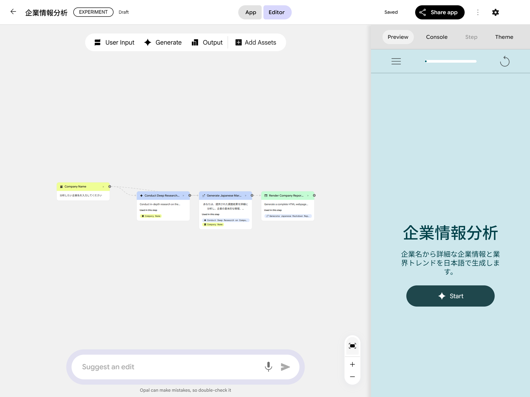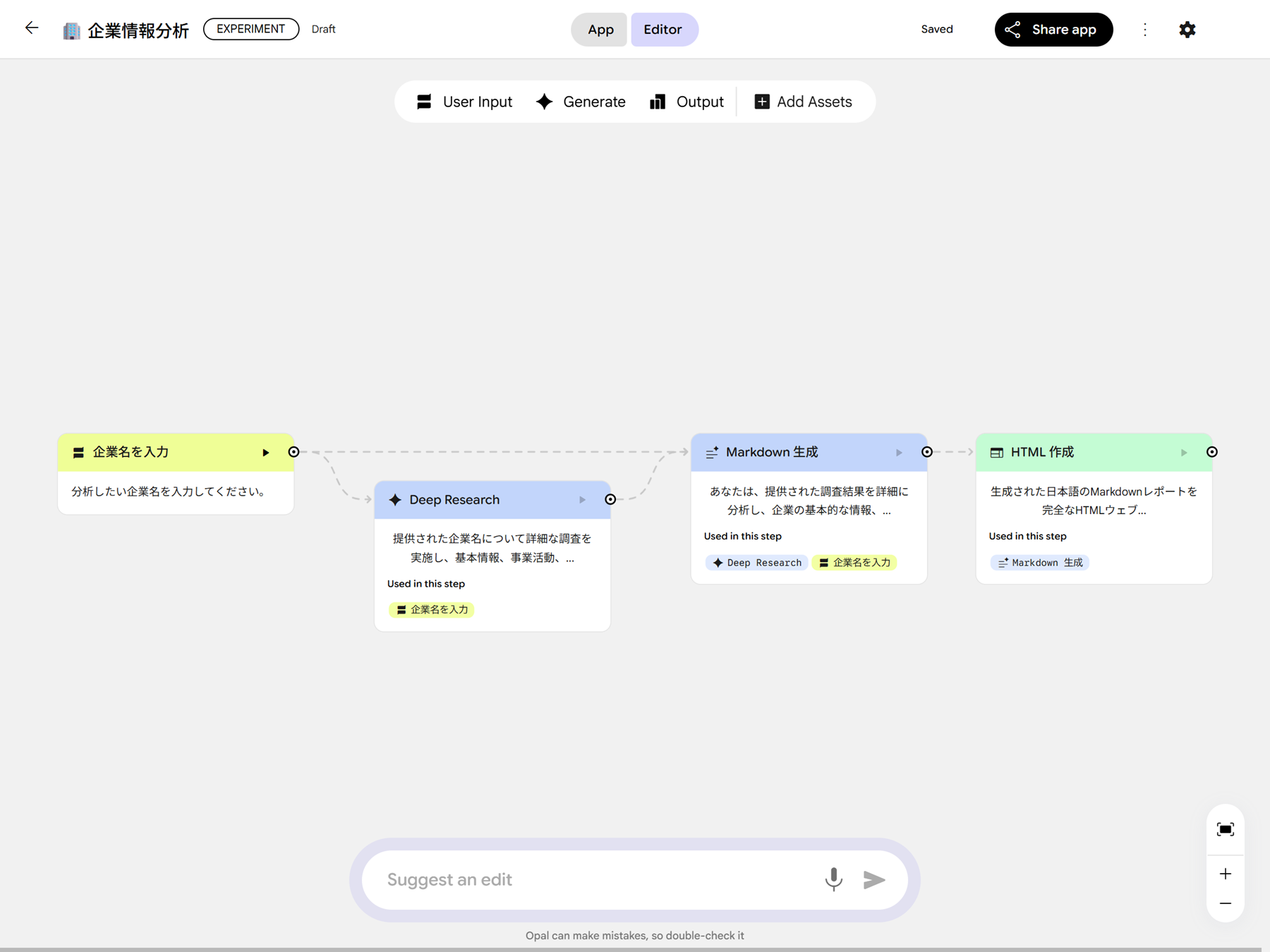 2025年10月29日 ノーコード AI ミニアプリケーション構築ツール Opal を試す Gemini Google Cloud 生成AI(Generative AI) 検索する Popular tags 生成AI(Generative AI) Vertex AI Search Looker Studio BigQuery AlloyDB Google Workspace 事例紹介 Cloud SQL Category Google Cloud Author tom SHARE 目次 Opal とは AI ミニアプリケーションを構築する まとめ Content AI を活用したアプリケーションを構築したいと考えているものの、「プログラミングの知識が必要で難しそう」「手間がかかりそう」と感じ、なかなか一歩を踏み出せない方も多いのではないでしょうか。Google から発表されたノーコード AI ミニアプリケーション構築ツール「Opal」(オパール) を使用すれば、そのような課題を解決できるかもしれません。 本記事では、2025年10月14日時点での検証をもとに、Opal を使用して AI ミニアプリケーションを構築する方法をご紹介します。この記事が、みなさんにとって AI アプリケーション構築の新しい一歩を踏み出すきっかけとなれば幸いです。 Opal とは 「Opal」(オパール) は、ノーコードで AI ミニアプリケーションを構築できるツールです。プログラミングの知識がなくても、自然言語での指示や直感的な UI 操作だけでミニアプリケーションを構築できます。構築したアプリケーションはすぐに実行・共有できるため、誰でも手軽に AI を活用したミニアプリケーション開発を行えるようになります。 ノーコード または ローコードで AI アプリケーションを構築するサービスには Dify や n8n、OpenAI の Agent Builder などがありますが、その中で Google が新たに発表したのが Opal です。Opal は 2025年7月24日に米国限定で提供開始され、同年 10月7日に日本を含む 15か国へ提供地域が拡大されました。 留意点として、現時点 (2025年10月14日) では、外部サイトや API との連携機能は提供されていない ので、今後のアップデートでの実現が期待されています。 Introducing Opal: describe, create, and share your AI mini-apps Expanding access to Opal, our no-code AI mini-app builder AI ミニアプリケーションを構築する Opal でミニアプリケーションを構築する方法には、新規で構築する方法 と 既存のアプリケーションをコピーして構築する方法 (Remix) の 2 種類があります。今回は、ユーザーが入力した企業名をもとに、その企業の基本情報や業界動向などの情報を出力する AI ミニアプリケーションを新規で構築します。 1. Opal にアクセスします。ログインを求められた場合、任意の Google アカウントでログインします。 2. 画面上部にある Create New を押下します。 3. 画面下部の入力欄に構築したいアプリケーションの内容を入力して実行します。今回は、以下のプロンプトを使用します。 入力された企業名の以下の情報を HTML 形式で出力する AI アプリケーションを構築します。 処理内容やプロンプトなどすべて日本語で構築してください。 * 基本情報 * 主要事業内容 * 取り扱い製品・サービス * 企業のビジョン * 事業内容 * 業界動向 数秒でワークフローが自動的に構築されました。概ね想定どおりの処理内容になっていそうですが、一部日本語化されていない箇所があります。そこで「プロンプトなど日本語になっていない箇所を日本語に修正してください。」と入力し、修正をリクエストします。このように、自然言語で指示を出すだけで、AI が自動的にアプリケーション修正・改善してくれる AI 駆動開発が Opal の魅力です。 プロンプトで修正をリクエストしたり、画面右側の Step タブから直接修正を行ったりして、最終的に以下のようなミニアプリケーションを構築しました。 1. 企業名を入力: 企業名の入力を受け付けます。 2. Deep Research: 入力された企業名について関連情報を収集します。(Deep Research with Gemini 2.5 Flash を使用) 3. Markdown 生成: 収集した関連情報を分析し、Markdown 形式でレポートを生成します。(Gemini 2.5 Flash を使用) 4. HTML 作成: 生成されたレポートを HTML 形式で出力します。(Gemini 2.5 Flash を使用) アプリケーションの保存先 使用している Google アカウントの Google Drive に「Opal」フォルダが自動的に作成され、その中にアプリケーションが保存されます。 アプリケーションを構築する際の Tips アプリケーションタイトル、ディスクリプションを変更したい。ヘッダの「︙」アイコン > Edit name and description から変更できます。 テーマを変更したい。画面右側の Theme タブから変更可能です。Themes for your Opal app の Upload で任意の画像をアップロードするとアプリケーションのイメージを変更できます。また、イメージを変更すると自動的にイメージに紐づくテーマカラーになります。 Step で他 Step の処理結果を使用したい。Step 同士を接続する必要があります。接続すると自動的に処理結果が Step に追加されます。 アプリケーションの変更履歴を確認したい。ヘッダの「︙」アイコン > Show version history から確認できます。 動作確認 ミニアプリケーションが構築できたので、動作を確認します。ヘッダの Editor タブを App タブに切り替え