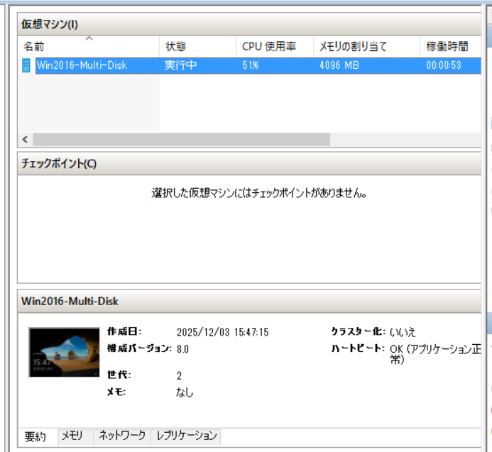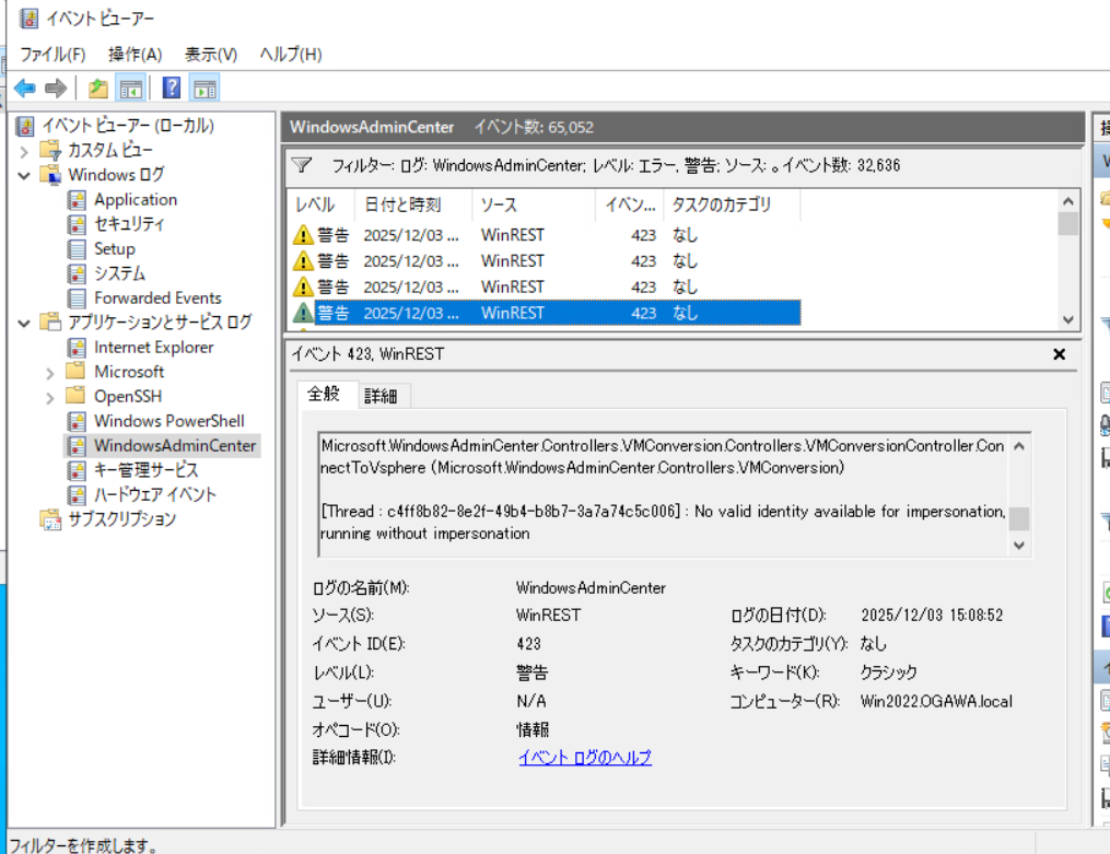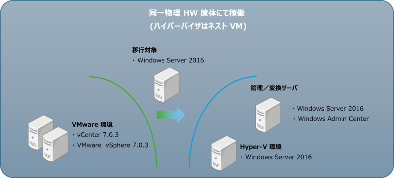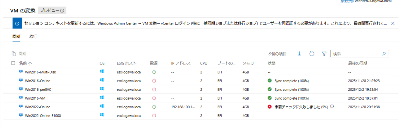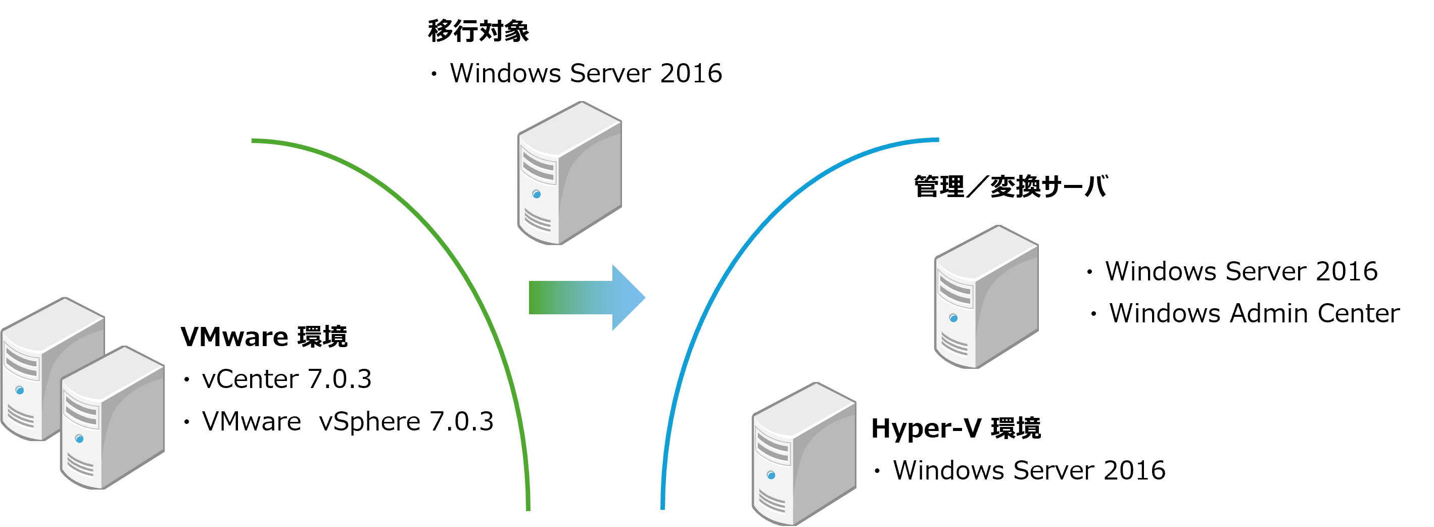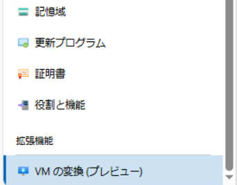2025年12月25日 「VM Conversion」で VMware 仮想マシン移行してみた Hyper-V VMware 検索する Popular tags 生成AI(Generative AI) Vertex AI Search Looker Studio BigQuery AlloyDB Google Workspace 事例紹介 Cloud SQL Category インフラ Author k-hirase SHARE 目次 「VM Conversion」のサポート状況 環境準備 移行してみよう 移行して気になったポイント まとめ Content 仮想ハイパーバイザ見直しの潮流を受けてかどうか、Microsoft 社から正式に Hyper-V への移行ツール「VM Conversion」がリリースされました。現時点ではまだプレビュー版ですが、この期間でも徐々に機能が拡充している様子ですので、実際に試すことで実用性を確認したいと思います。 「VM Conversion」のサポート状況 VM Conversion のサポート要件です。 2025/12 時点では少し古めの vCenter サーバや ゲスト OS もサポートされているようです。 ※ 移行元にて vCenter サーバ の準備が必須です。 1)移行元の VMware vCenter サポート対象 バージョン vCenter サーバ VMware vCenter 6.x VMware vCenter 7.x VMware vCenter 8.x 2)移行対象のゲスト OS サポート対象 バージョン Windows オペレーティング システム Windows Server 2025、2022、2022 Azure Edition、2019、2016、2012 R2 Windows 10 Debian ベースのオペレーティング システム Ubuntu Linux Ubuntu 20.04、24.04 Debian 11,12 RHEL ベースのオペレーティング システム Alma Linux CentOS Red Hat Linux 9.0 環境準備 1) 環境概要 今回は下記のような環境にて検証を行いました。 実際にあり得る移行シーンを想定し、少し古めの VMware 環境と延長保守切れも近い「Windows Server 2016」を移行対象として検証します。 ※ 検証資材の関係で、実際にはすべて同一の物理ホスト上で構築しています。 2) 移行環境を準備しよう! 紙面の都合上、前述の「移行対象VM、移行元ハイパーバイザ、移行先ハイパーバイザ、管理/変換サーバ(OS まで)」は既に準備してあるとものとして割愛します。 ① 公式手順に沿って Windows Server に 「Windows Admin Center(2.4.12.10)」をインストールします。 今回は検証のため「簡単セットアップモード」にて導入していますが、実際の環境では適切に設定を行ってください。 ② 追加のソフトウェアを導入します。 「Windows Admin Center」インストール後、「VM Conversion」を利用するために、追加で下記ツール/ライブラリの導入が必要です。 こちらも公式手順がありますので、そちらに沿って導入をお願いします。 VMware.PowerCLI Microsoft Visual C++ 再頒布可能パッケージ Visual Studio 2013 用 Visual C++ 再頒布可能パッケージ VMware Virtual Disk Development Kit (VDDK) バージョン 8.0.3 ※ 2025/12 時点で 8.0.3 をダウンロードするためには、Broadcom 社の Developer Portal へのログインが必要でした。 ※ ここまで見た瞬間で勘のいい方はお察しかと思いますが、拡張機能の概要としては「Windows Admin Center」から PowerCLI や VDDK を駆使して、スナップショット/同期/エクスポート/インポートを行うような仕組みのようです。 移行してみよう 環境が準備できたら、さっそく移行してみましょう ① 「Windows Admin Center」 にログインします。 ② 移行先のハイパーバイザを登録します。 ③ メニューの一番下にある「拡張機能 > VM の変換 (プレビュー)」を選択します。 ④ 「vCenter に接続する」を選択した後、「+追加」ボタンを押し、接続する vCenter サーバを設定します。 ⑤ 接続後、vCenter サーバに登録されている VM がリストアップされます。 ⑥ 「同期」タブにて移行する VM を選択し、「同期」を押した後で、同期先のディレクトリを指定します。 ※最大10台まで同時に同期が可能です。 → 状態列が「Sync complete (100%)」となっていたら同期完了です。 → この時点で、Hyper-V サーバの「⑥」で指定したフォルダに仮想ディスクが作成されています。 ⑦ 同期の正常終了後、「移行」タブにて移行するサーバを選択し、「移行」を押します。 静的 IP アドレスの移行や VMware Tools のアンインストールを実施する場合は、ここで選択します。 → 移行の状態列が「Destination VM Created. Migration complete (100%)」となっていたら移行完了です。 ⑧ Hyper-V マネージャにて移行した VM が起動していることを確認します。 以上で移行は終了です。 GUI で操作できるため、比較的簡単に移行ができるのではないでしょうか。 次章では、VM Conversion について少し深堀りしたいと思います。 移行して気になったポイント 本章では移行をしながら気になったポイントをまとめていきます。 無停止で移行はできるか → できません。 データの最終同期(差分同期)が終了した後移行元 VM を停止し、その後移行先 VM を起動する挙動となるため、必ず停止が発生します。 データベース等の整合性担保が必要なサービスは移行前に停止しておいた方が安全かと思われます。 ※ さすがに別ハイパーバイザに向けて vMotion/ライブマイグレーション のような仕組みは難しいのかもしれませんね。 移行の仕組み 現時点では「初期同期 → 移行(最終同期)」の2フェーズのみとなっています。 初期移行後に継続的な同期処理はできないようです。 移行前後の比